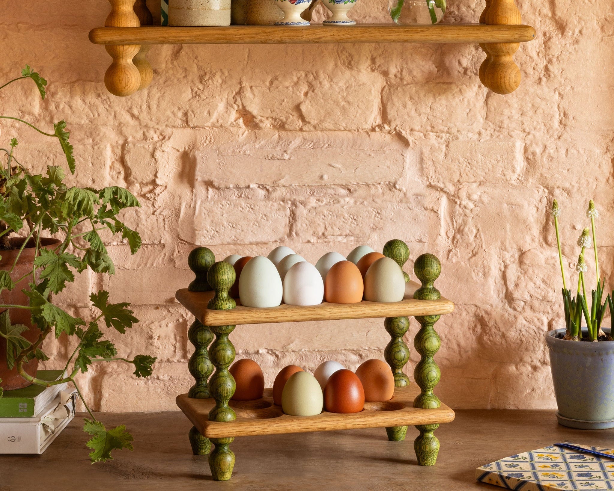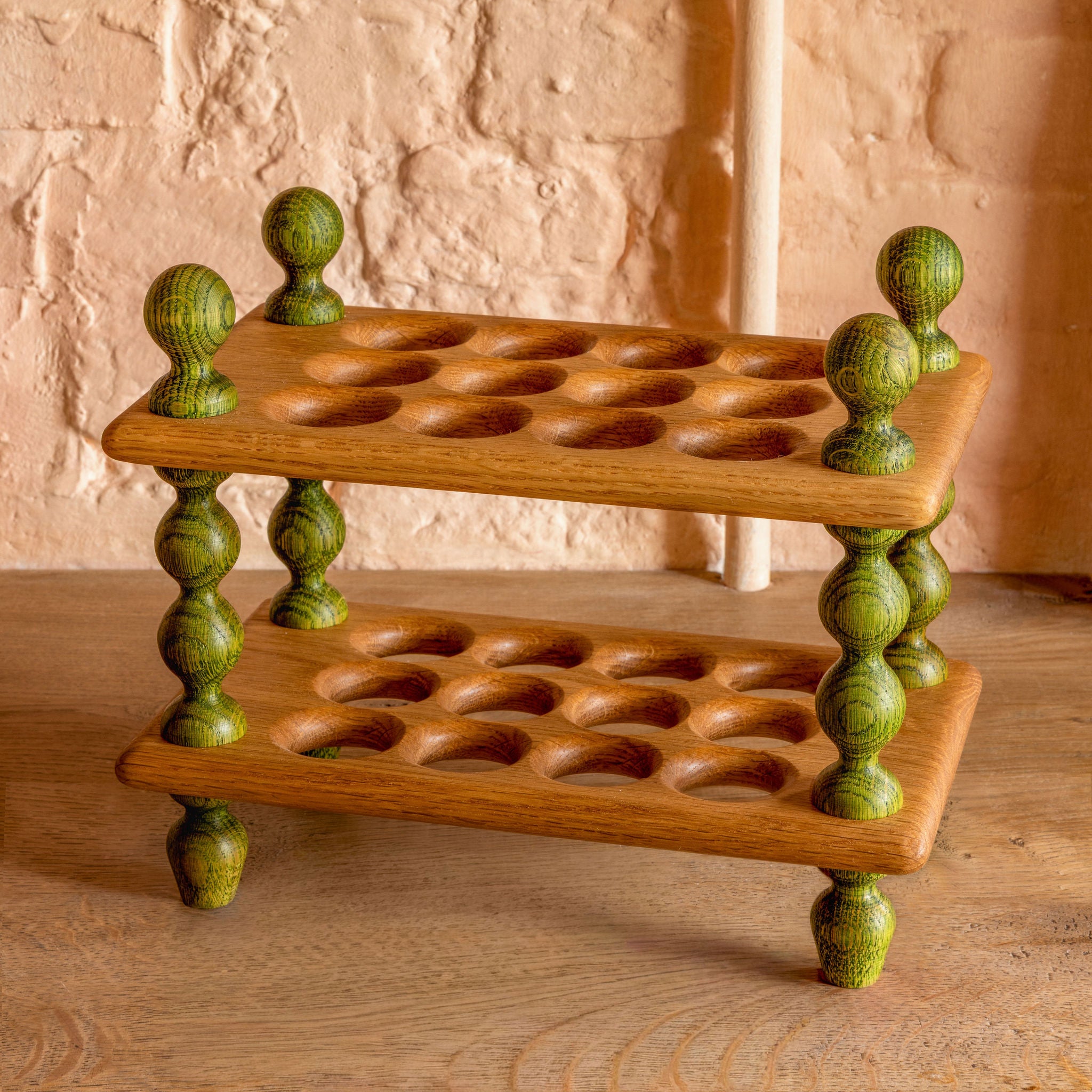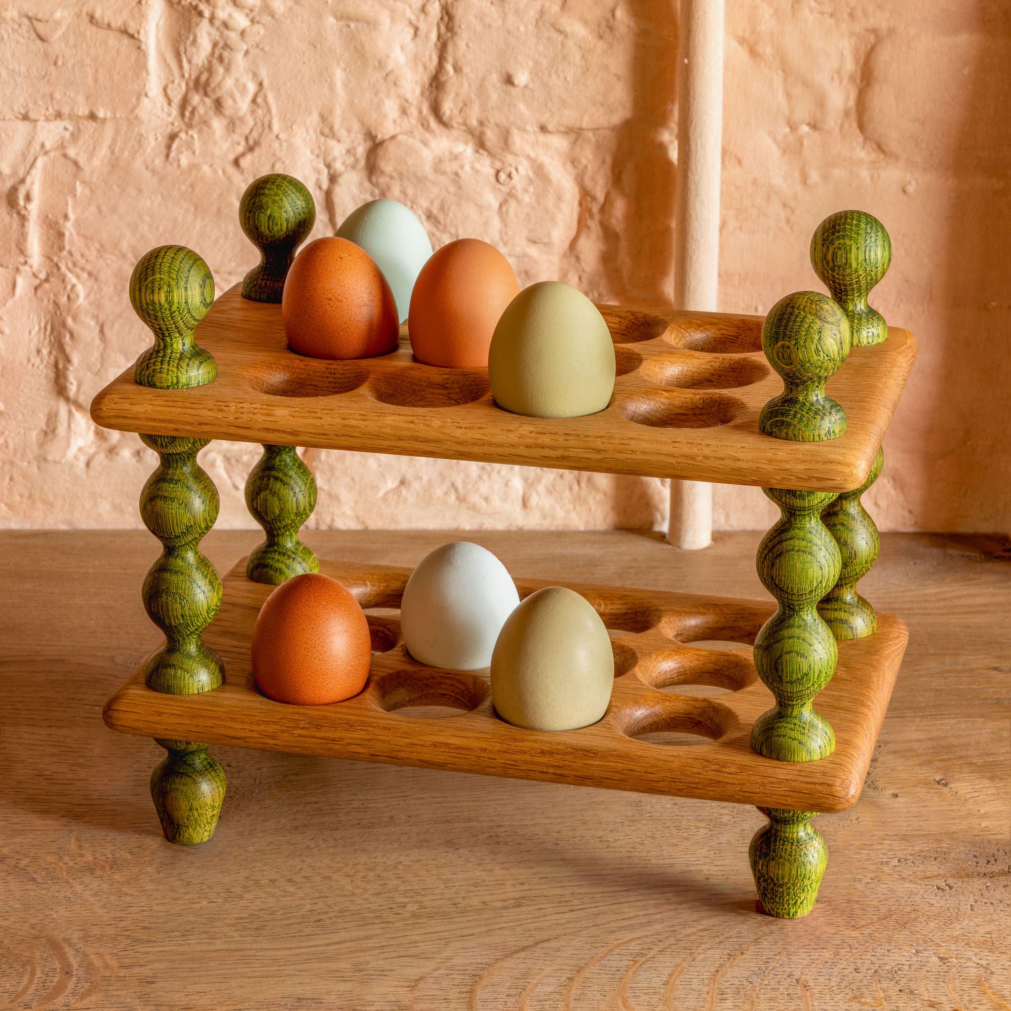 A bobbin egg rack with four green bobbin legs, finials and feet with natural oak flats.