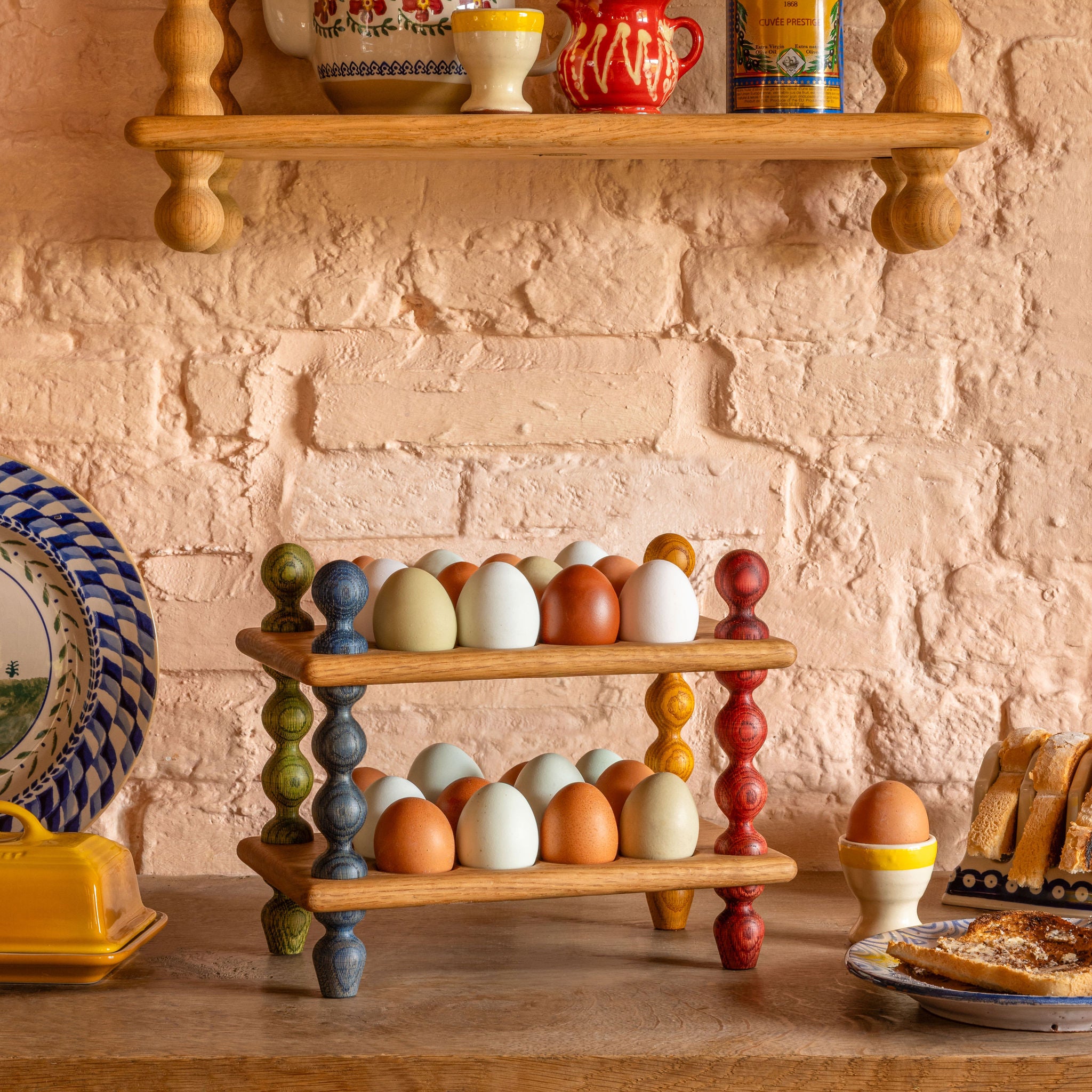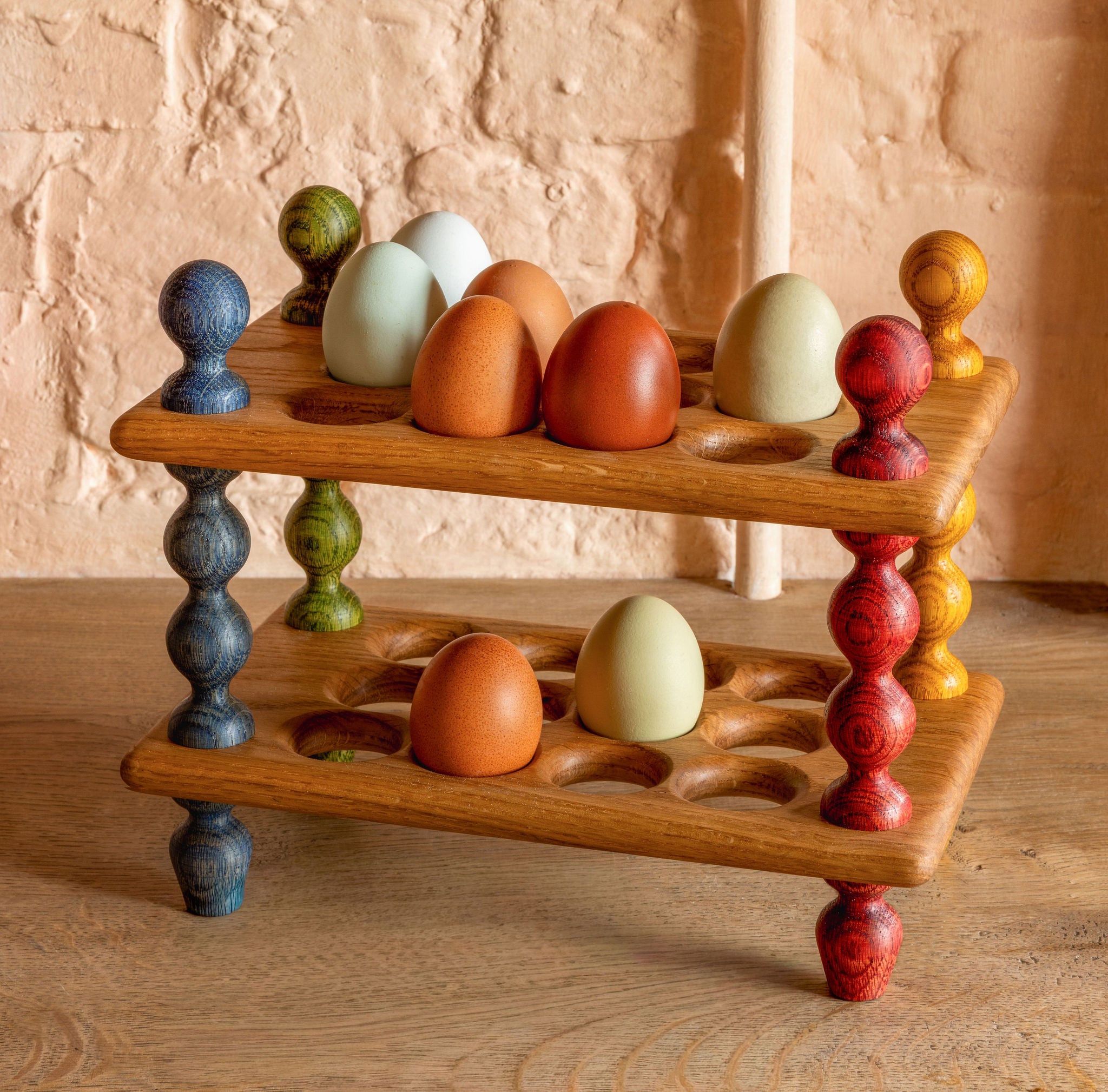 A bobbin egg rack with four colourful oak bobbin legs, finials and feet in blue, green, yellow and red stained oak with natural oak flats.